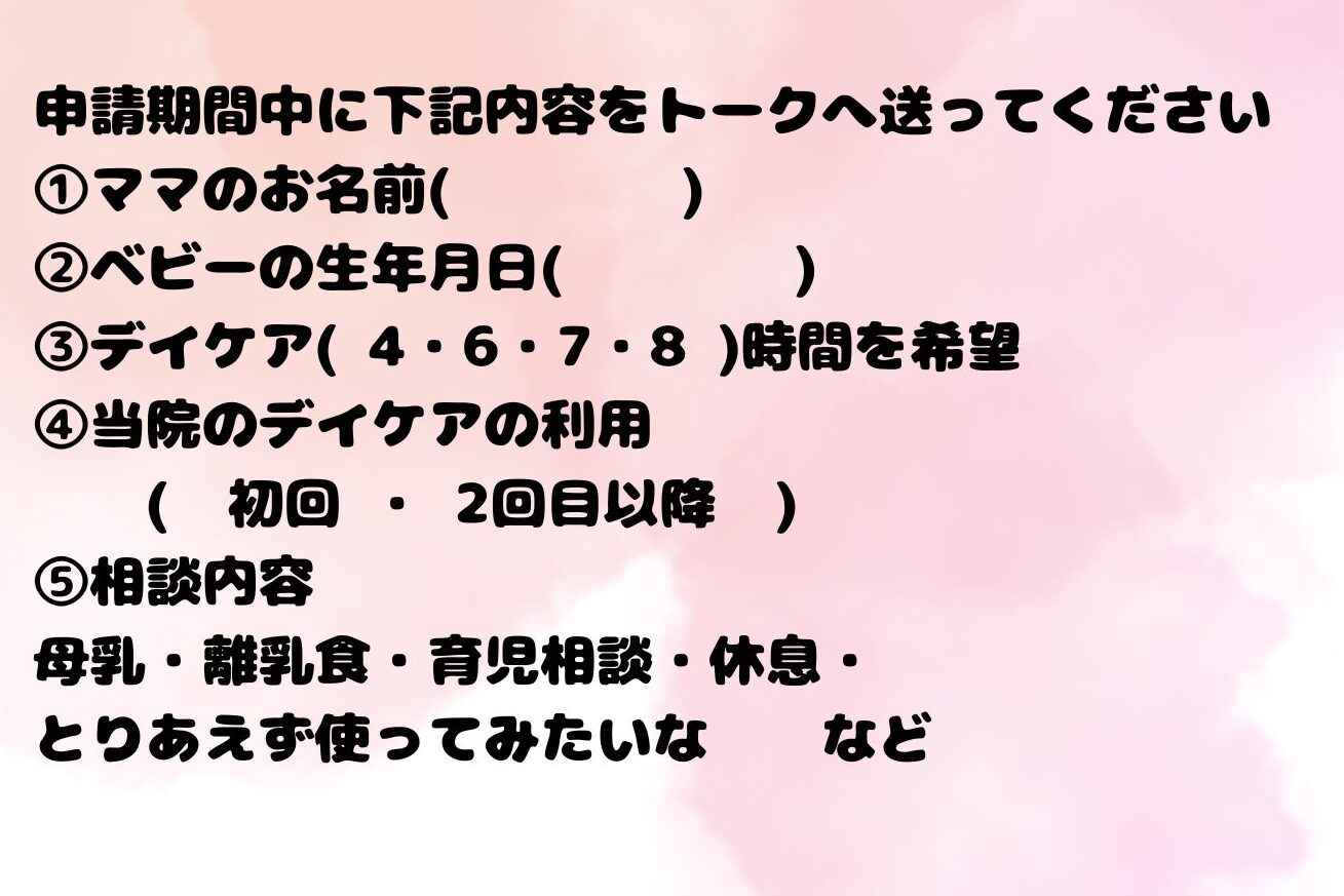 ●デイケア2時間、デイケア4時間(休息なし)、アウトリーチ、育児・母乳相談(自費)をご希望の方