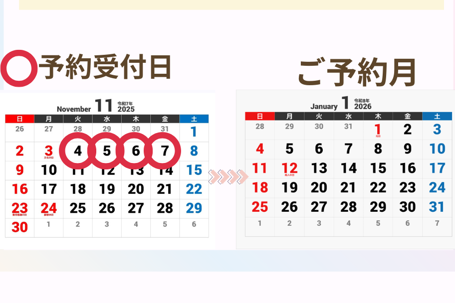 「予約月の2か月前の第1週目の平日 0:00~23:00」がご予約申請日になります。