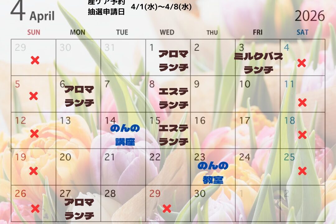 SCHEDULE スケジュール トップスケジュール2026年4月 2026.03.28 2026年4月 4月のスケジュールです〜 4月は、ランチ会がたくさんあるのですが、 すごく嬉しいことに、全部、ご予約枠が埋まっております。 ホントに、みんないつものんのをありがとう! 4月もまた、たくさんのママ&ベビーに出会えるのが楽しみです(◍•ᴗ•◍) ↑ 講座&教室の日程です! PrevBack to listNext