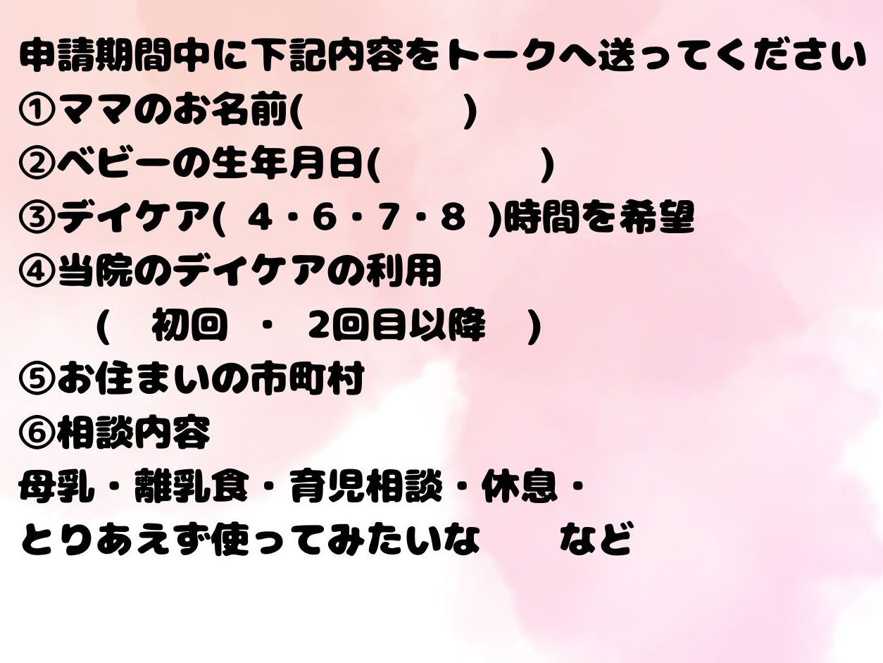 SCHEDULE スケジュール トップスケジュール2026.2月分の予約 2025.11.16 2026.2月分の予約 デイケア4時間~8時間のご予約の受付についてのご案内です。 デイケア2時間、デイケア4時間(休息なし)、アウトリーチ(訪問)、育児・母乳相談(自費)をご希望の方は、随時、ご予約を受け付けしていますので、直接、お問い合わせください。 2026年2月のご予約の申請は 2025年12月1日(月)〜12月5日(金)です 公式LINEへ下記内容をお送りください。 翌週に抽選し、順次結果と日時調整のご連絡をさせてきただきます。 PrevBack to listNext