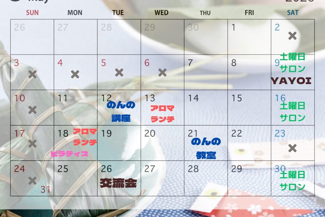 SCHEDULE スケジュール トップスケジュール2026.5月 2026.04.26 2026.5月 5月の予定です(◍•ᴗ•◍) 5月のランチ会はアロマ&ランチ会が2回。 講座&教室の日です〜 ピラティスの日 PrevBack to listNext